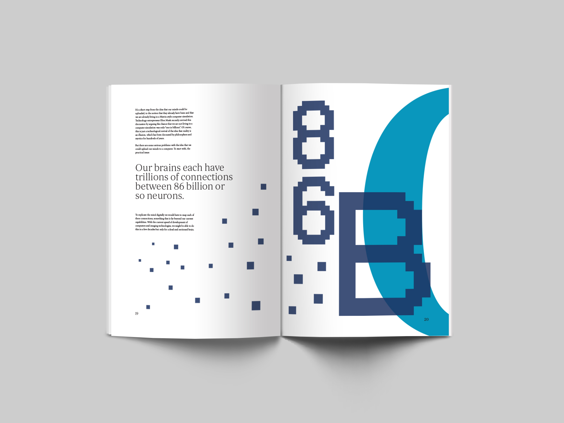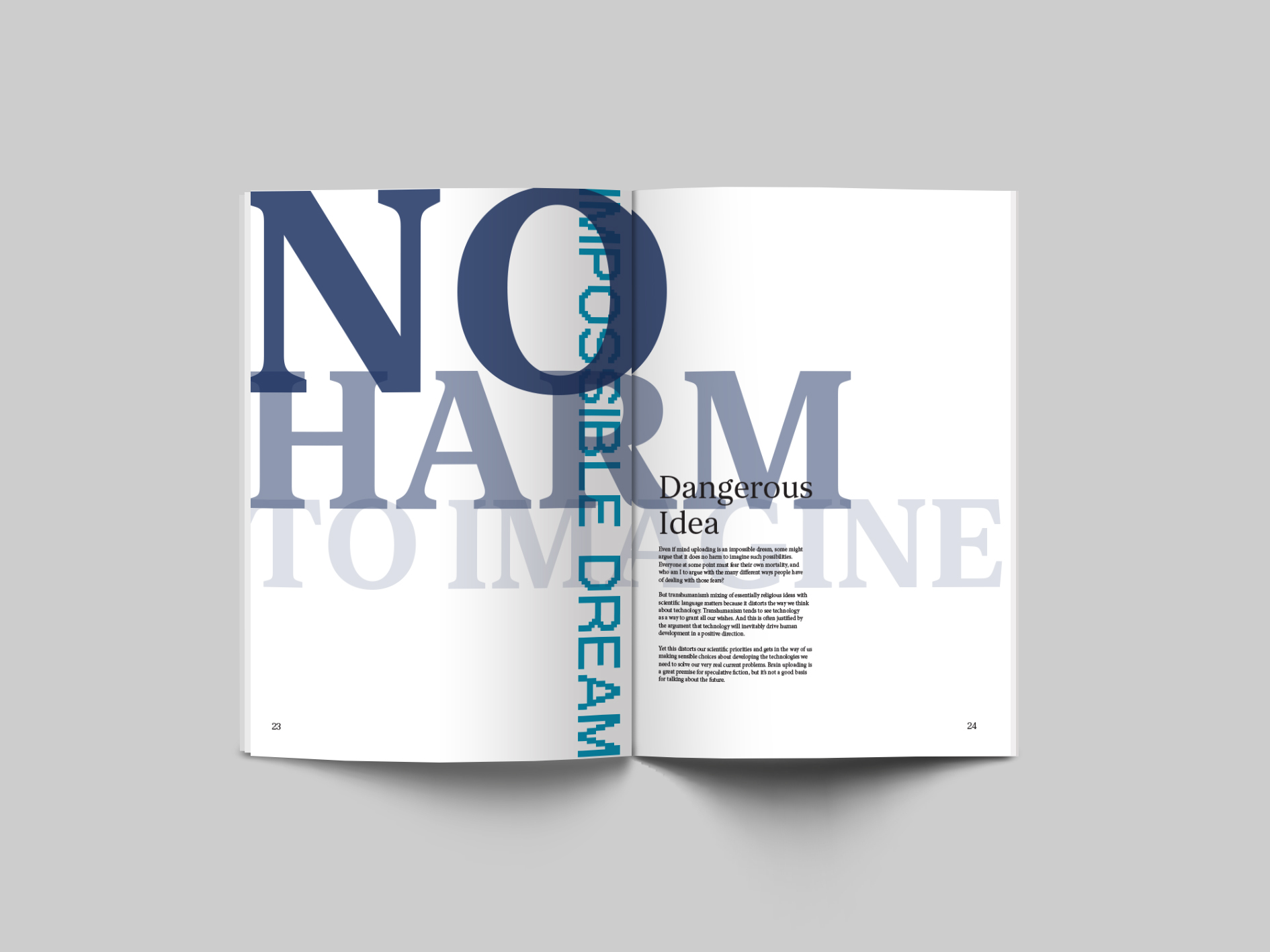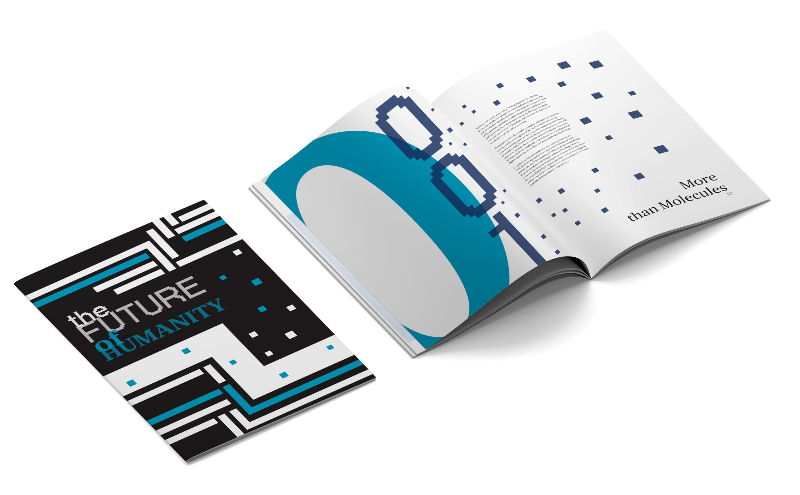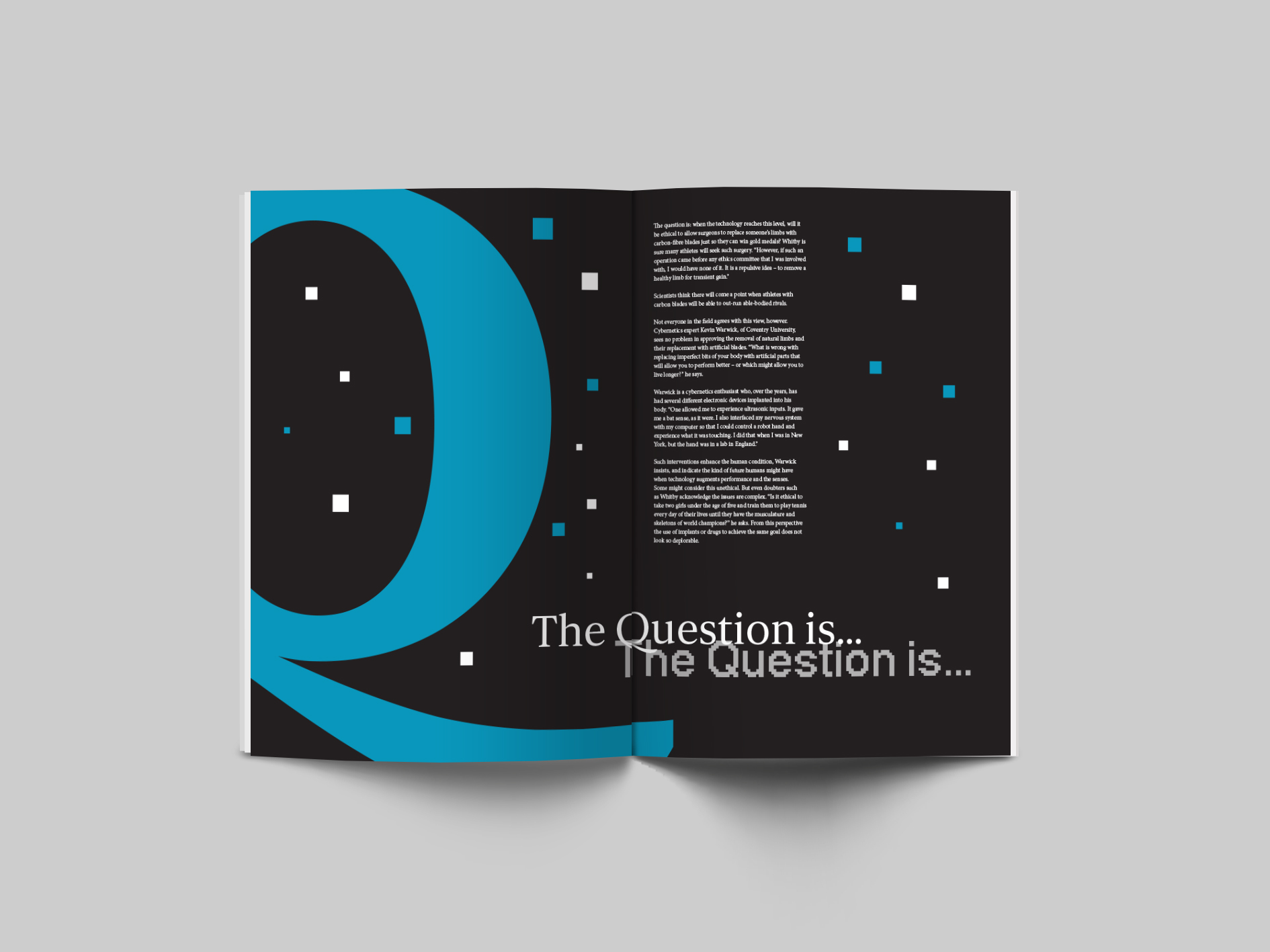 Brief: Design and produce a publication mock up that contains a collection of articles about a topic. My chosen topic was transhumanism. This is the belief or theory that humans can evolve more than their current form physically and mentally through the means of science and technology.