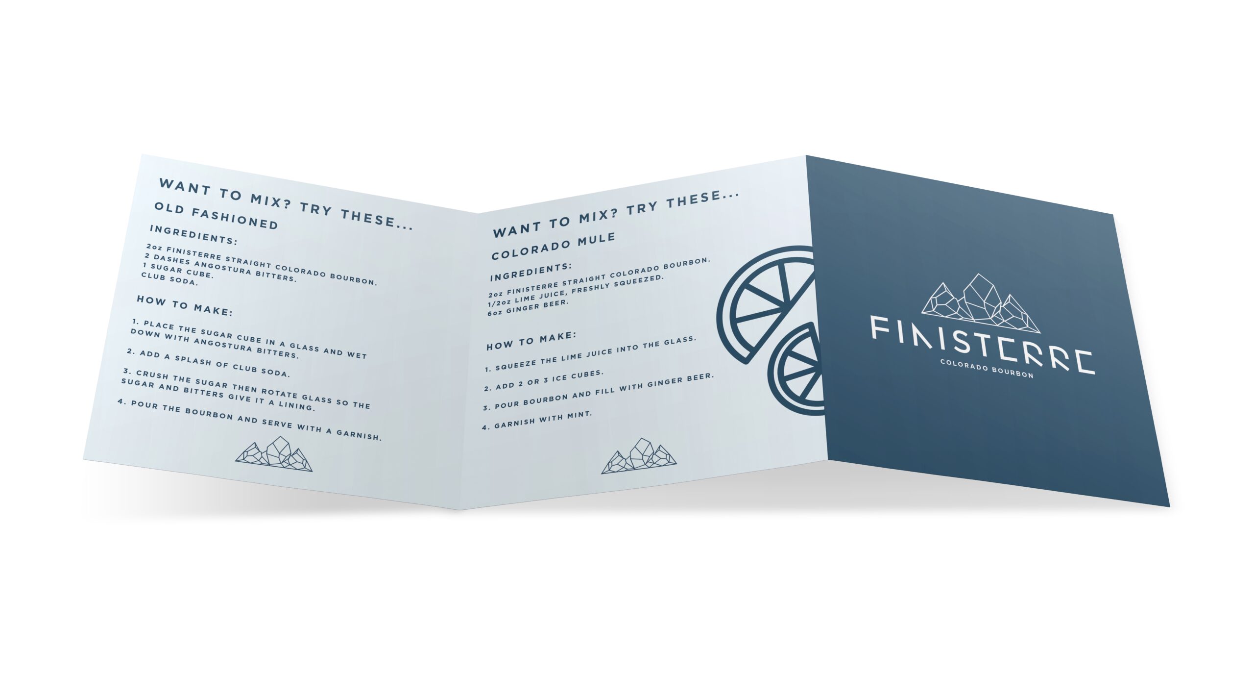 As well as the business cards and letter head, I designed some bourbon bottle labels, box packaging for the bourbon and an extra serving recommendation card. I thought these would be appropriate extras to design, to make the company seem more real. The shape of the label is different to what you would usually see in a store. I wanted it to represent the brand and the logo where I have used similar shapes to create the mountains.