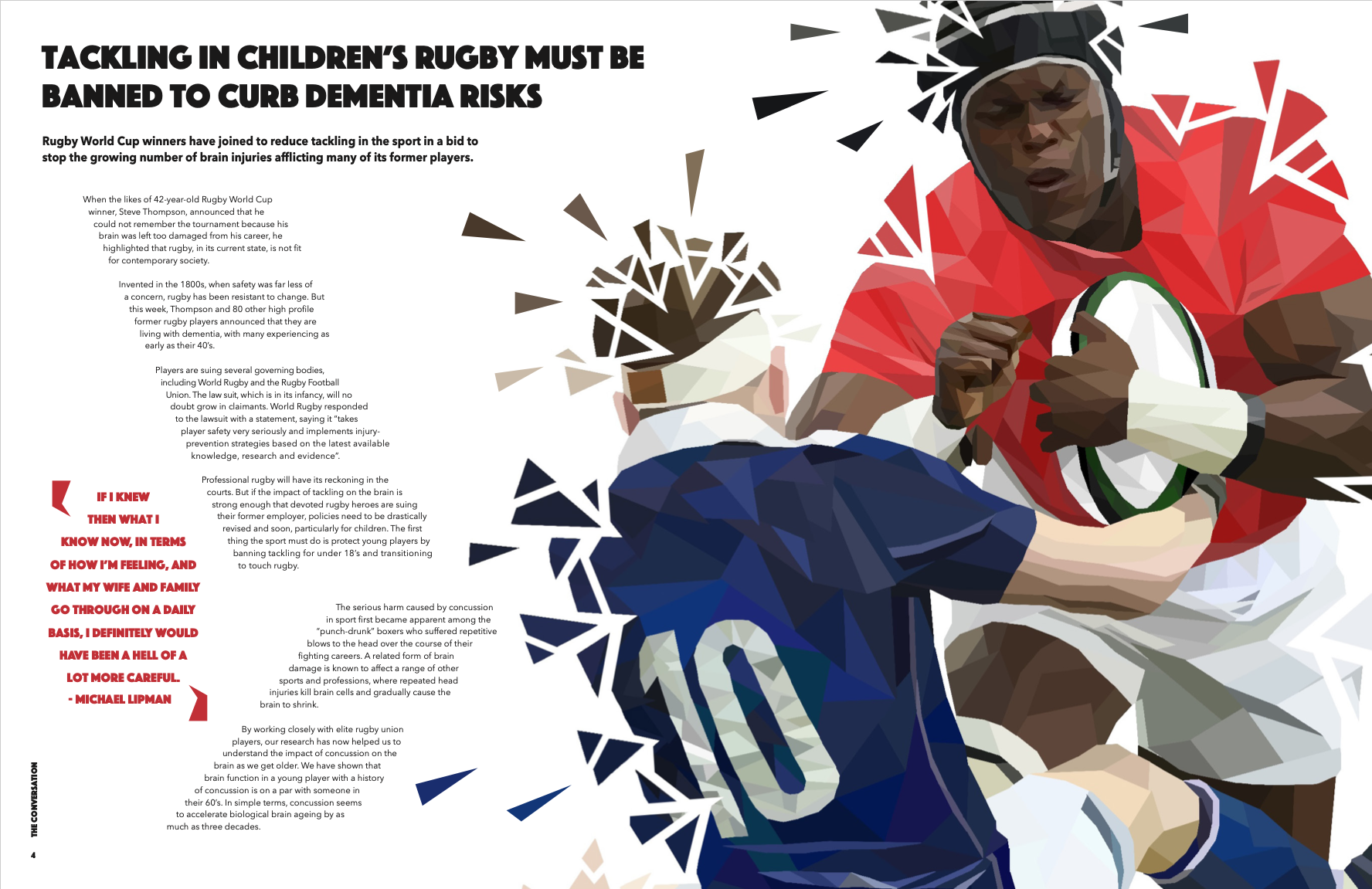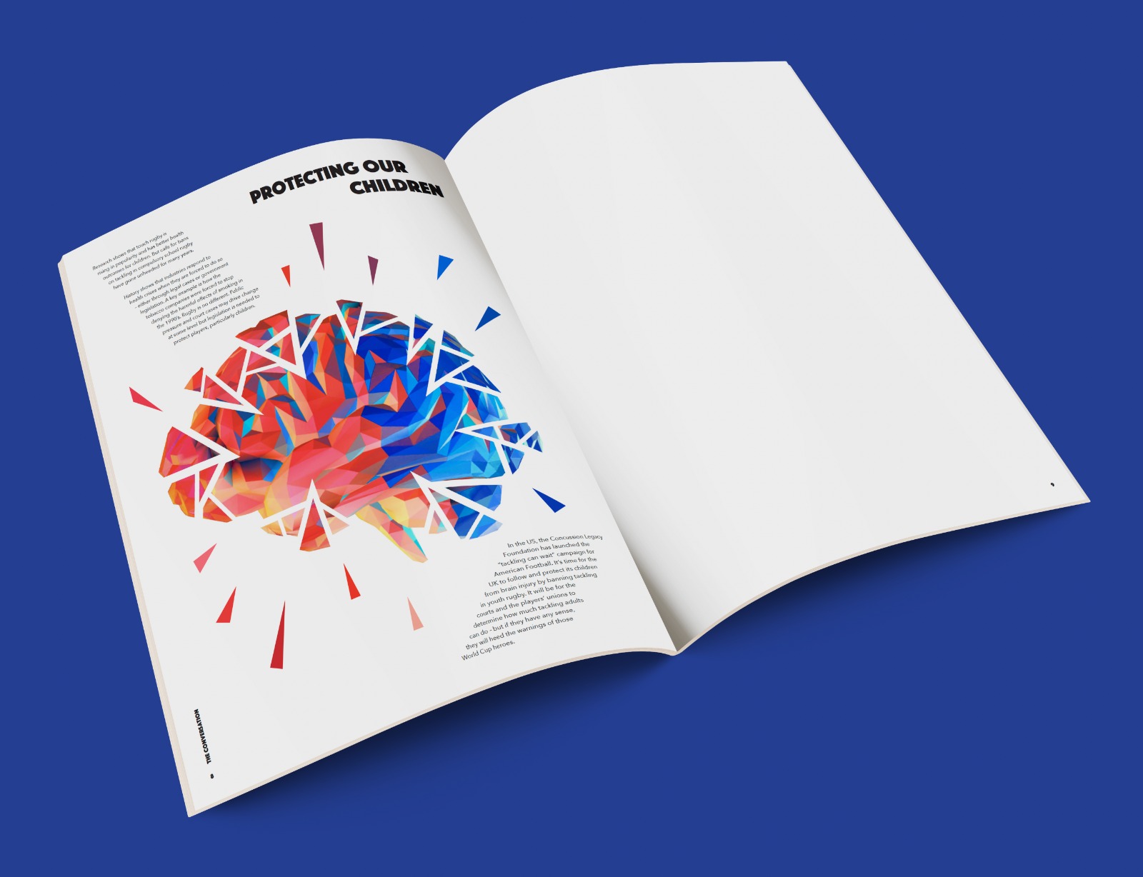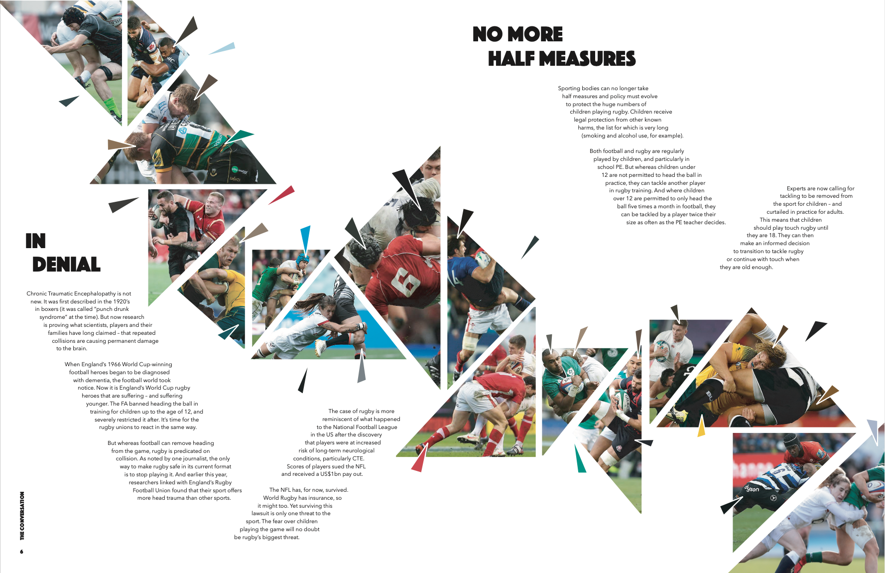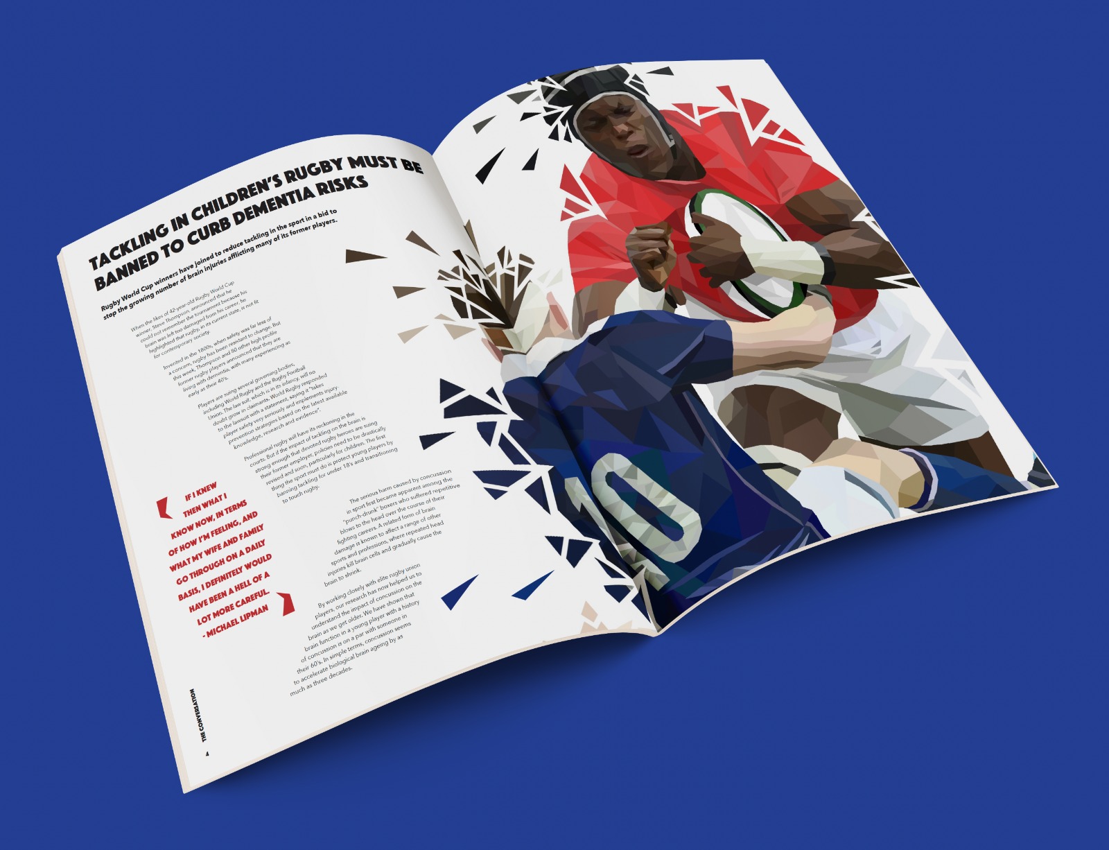 This is an editorial design project for a magazine article about early onset dementia, concussion and tackling in children’s rugby. The brief stated to use an article of your choice and create a series of magazine spreads to represent the article and its information.